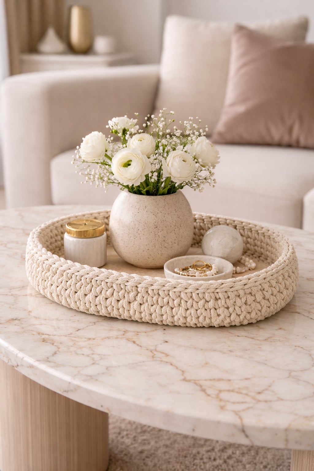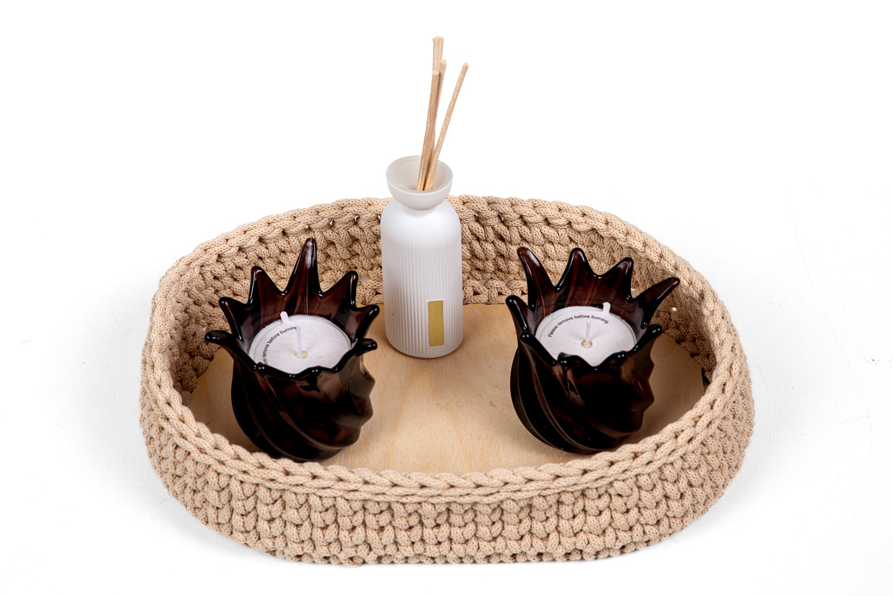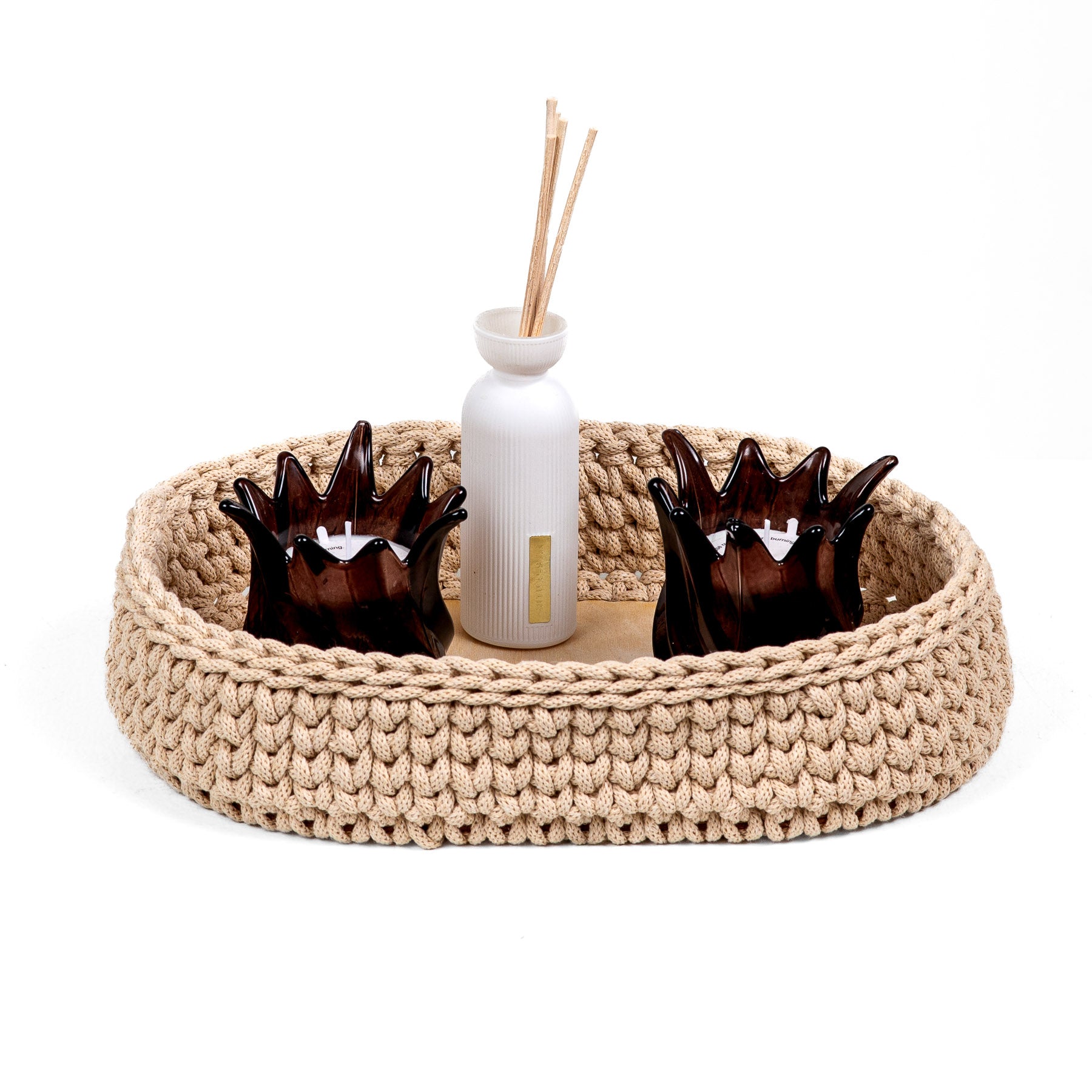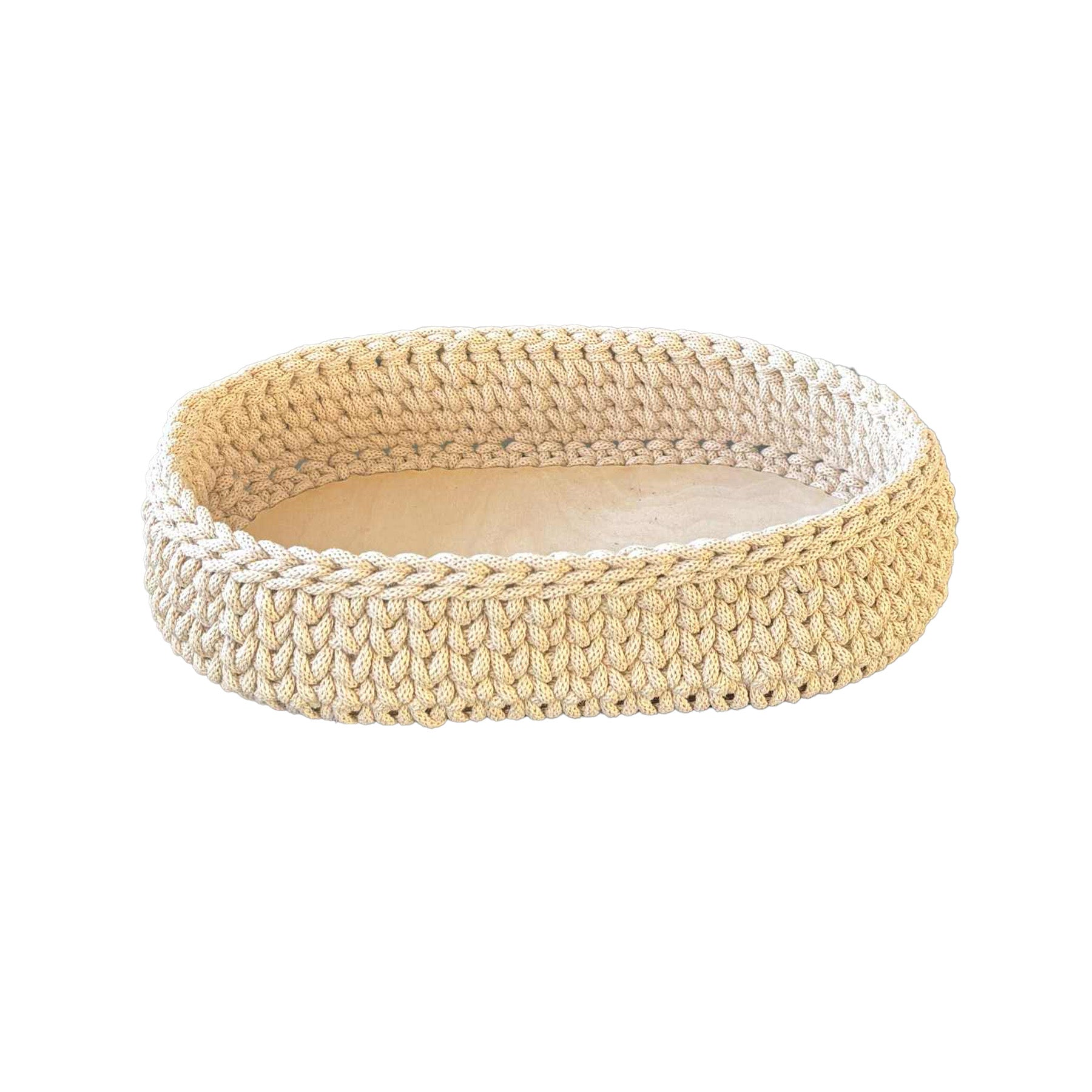 Hand-crocheted storage basket made from cotton yarn with an oval wooden base.