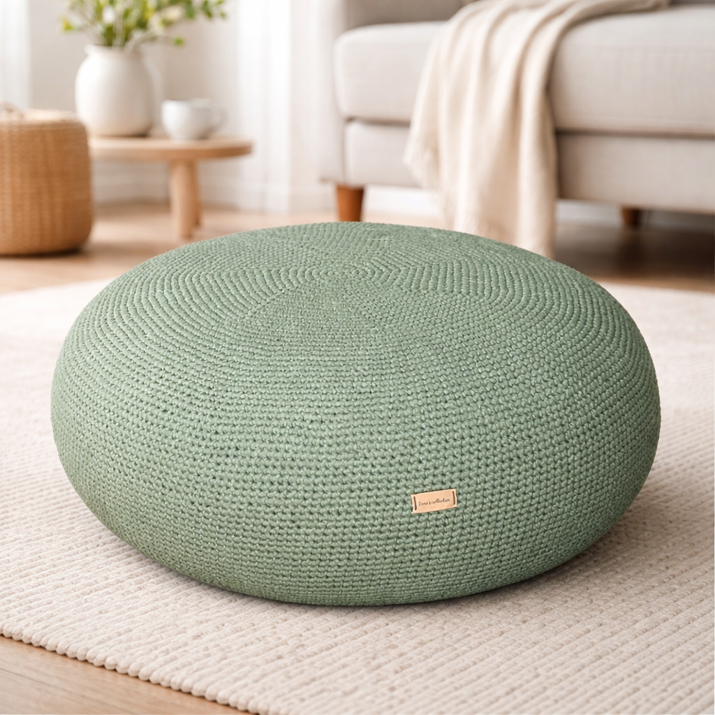 The puff cover is handmade in soft cotton yarn, making each piece unique. Small variations in size, shape, and color may occur, adding charm and character.